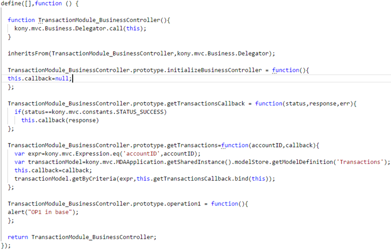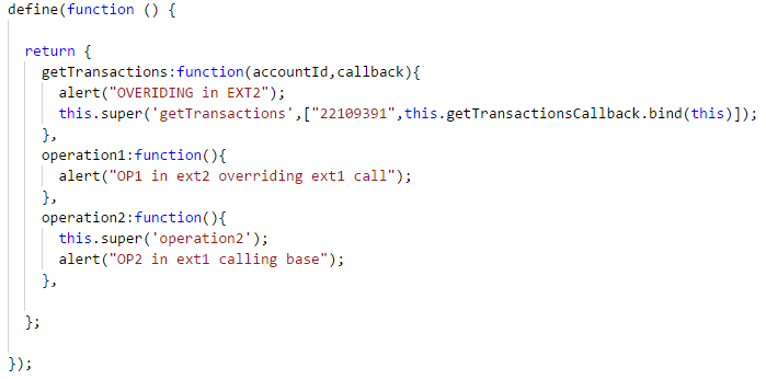 • In this extension, we have overridden the base BusinessController method getTransactions. In this new method, getTransactions of businessExtension2, we just add one line and then again call the base method using the super method.