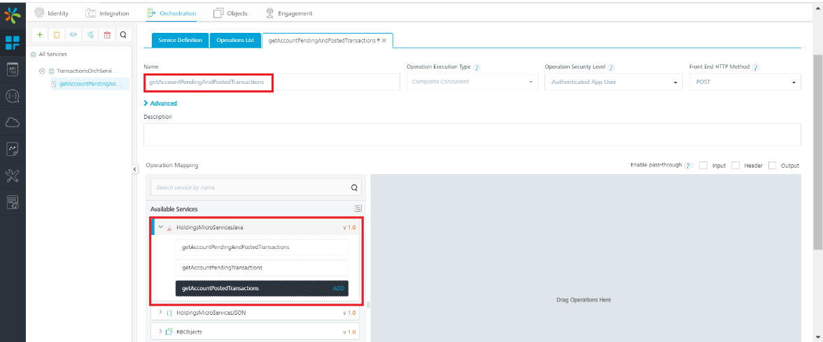 - Under Operation Mapping > Available services, search and add the getAccountPendingTransactions and getAccountPostedTransactions services to the Orchestration service.