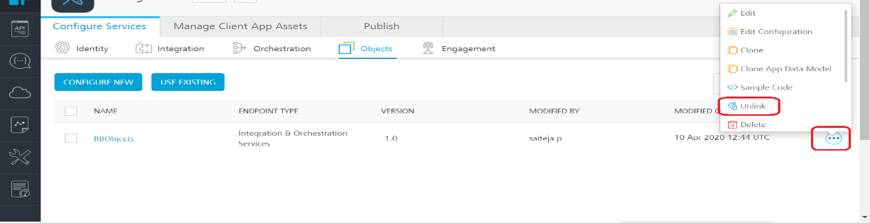 - Search for RBObjects Object service, and then click the ellipsis (three-dot) on the right of the RBObjects service. The context menu opens.