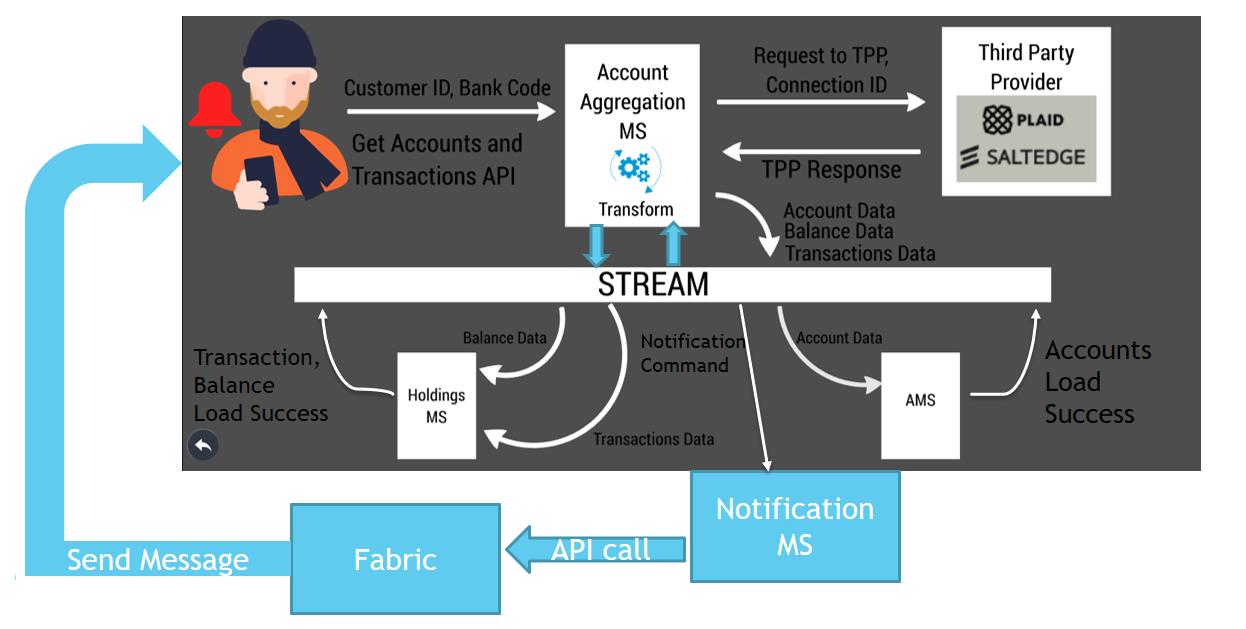 - The Notification microservice acts as an intermediate layer between the Account Aggregation Microservice and Fabric. It generates notifications for the events defined below and sends the request to Fabric.