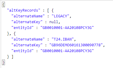 - In the below screen capture, the alternate entity is updated. The file name of the spec file is AA_ARR_ACCOUNT_ArrangementAlt.json.