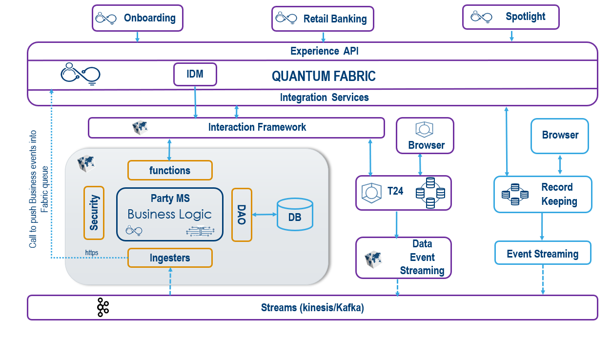 To manage the party information that is required for both front end (Infinity) and back end (Transact or any other back-office system of the bank), Party microservice must provide an independent cloud-enabled solution. The record that is created in the Transact Customer application is captured by the DES component, which is added to the Streams (Topics). The Ingestor component subscribes the Topics and creates/updates an entry in the microservices’ database accordingly. Microservice must expose management APIs through IRIS for the bank users to manage party information for products managed in Transact.