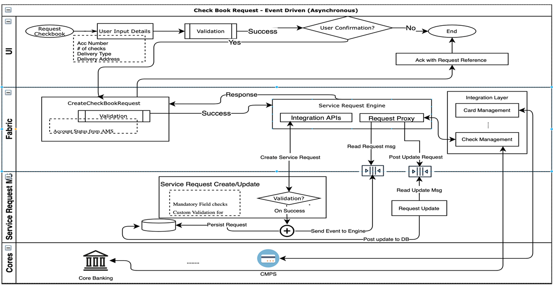 - To serve different types of service requests such as New Cheque Book, Change of Address or Contact Number, Bank Statement, and Interest Certificate, the Service Request microservice provides an abstraction from the core in Infinity.