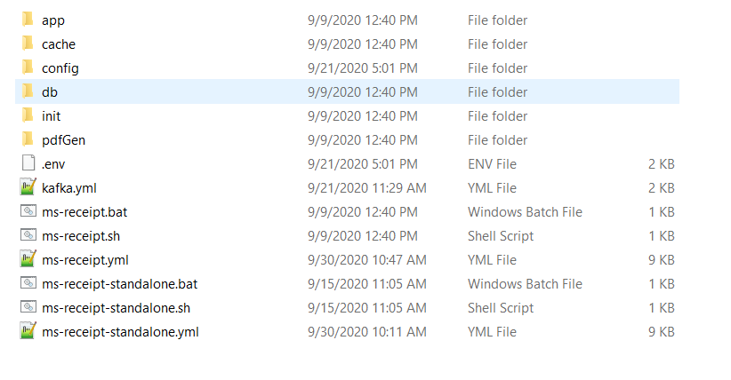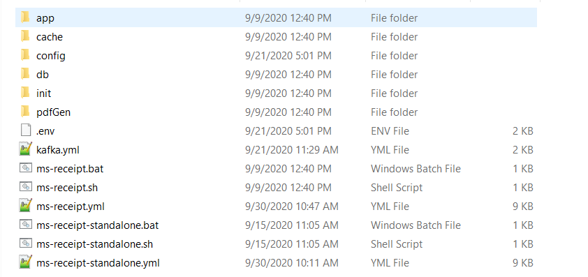 The receipt microservice for docker deployment is available as a single release bundle ms-receipt-package-docker-<release.xxx>.zip