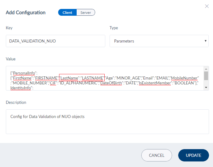 4. Search for the DATA_VALIDATION_NUO key and select Edit from the contextual menu. The Add Configuration window appears.