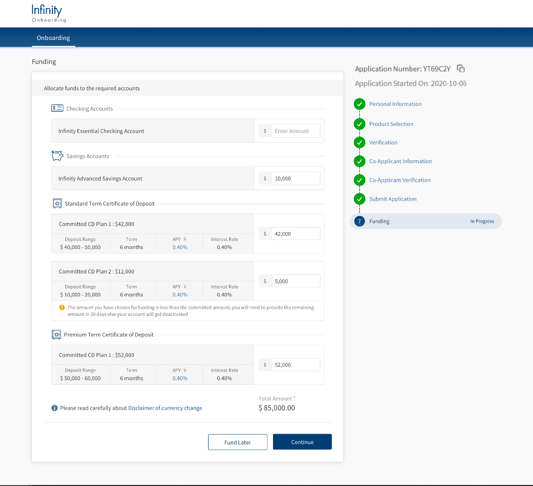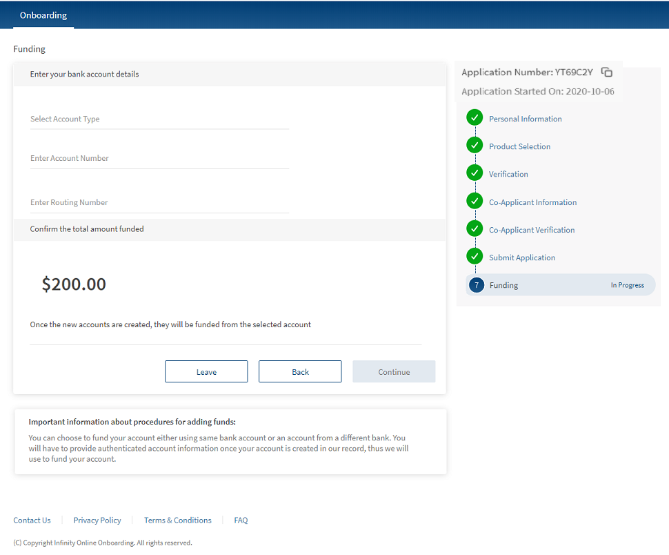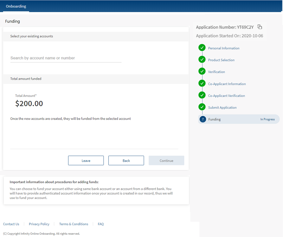 Infinity Onboarding provides a fund transfer feature by using which you can transfer funds to the products that you selected while opening an account.