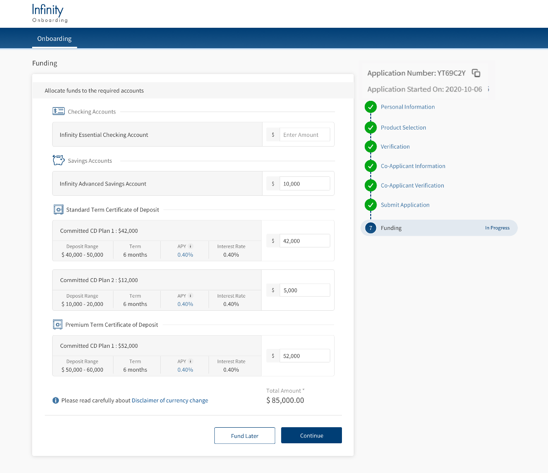 - If you are trying to fund a product from an account whose currency is different from the selected product, the Disclaimer of currency usage option appears in the following sections during the Funding flow.