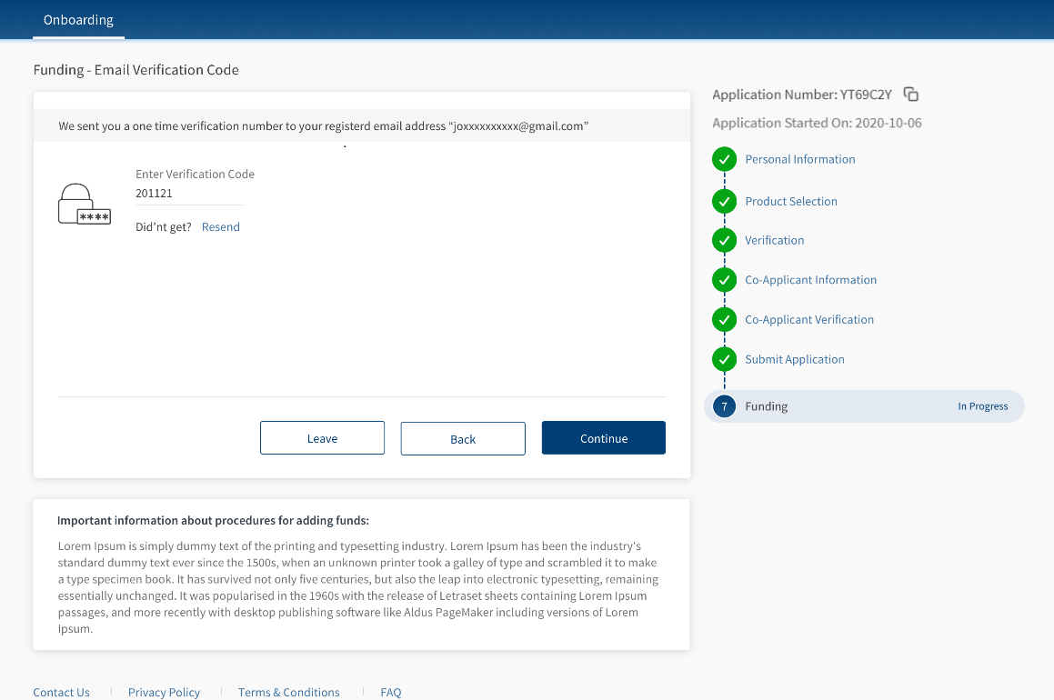 If you agree with the content, click Yes. Otherwise, click No. - After you choose to leave the application, you cannot resume the funding flow. It is because the Onboarding app does not support the resume flow for Funding. However, you can fund your accounts by using the Transfer Money feature of the Retail Banking app.