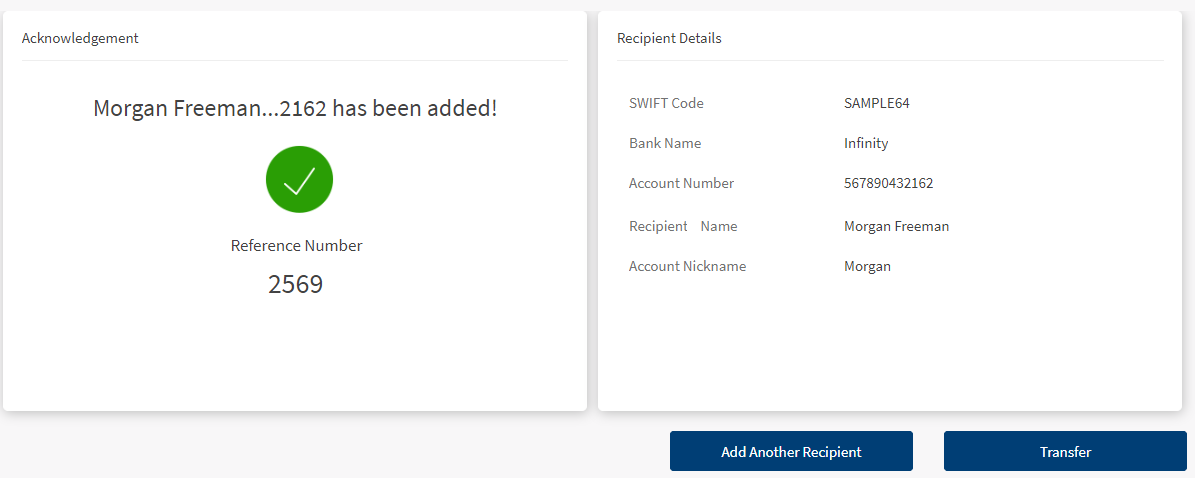 - Click Add Recipient. The app displays the acknowledgment screen with an acknowledgment message and account details confirming that the recipient has been added.
