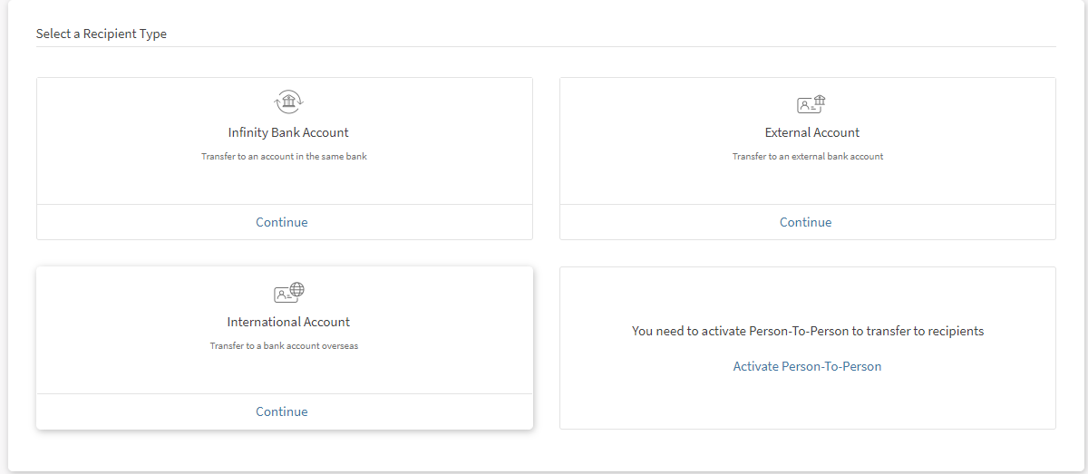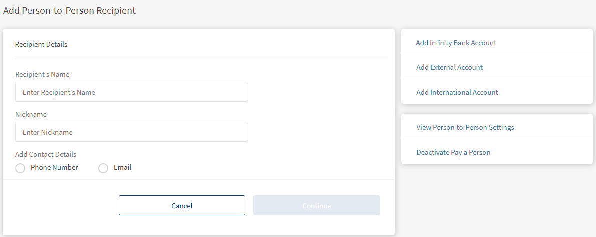 - Click Add Person-to-person recipient from the right pane of the transfers screen. You can also click Add Recipient from Transfers menu. The Add Recipient screen appears with an option to select the recipient type.