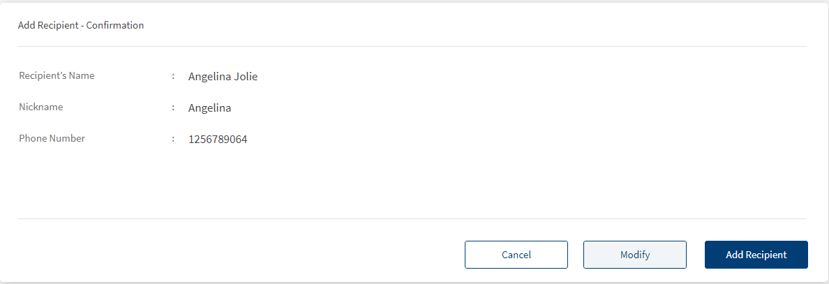- Verify the details and tap Confirm and Add Recipient. Tap Cancel if you do not want to add a new recipient.