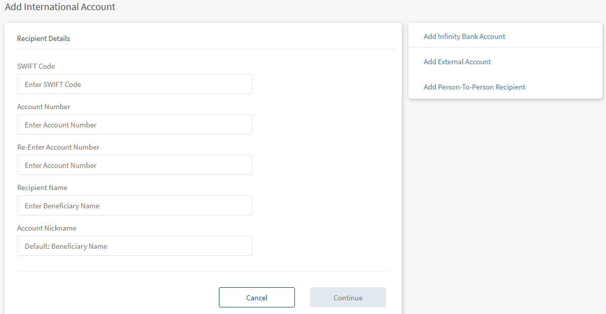 Use the feature to add a recipient who has an account in an international bank or add your own account available in the international bank by providing the required information. Click Add International Account from Add Recipients screen