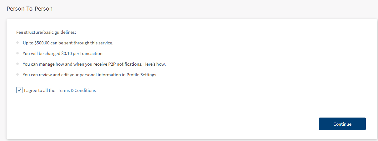- When you open the P2P screen for the first time, the app displays the terms and conditions for you to activate the P2P payment service.