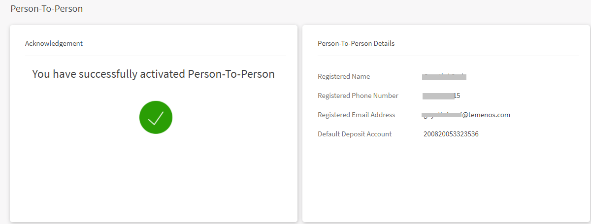 - Once P2P is activated, a confirmation message is displayed with your details. You can send and receive money via your email ID and mobile number.
