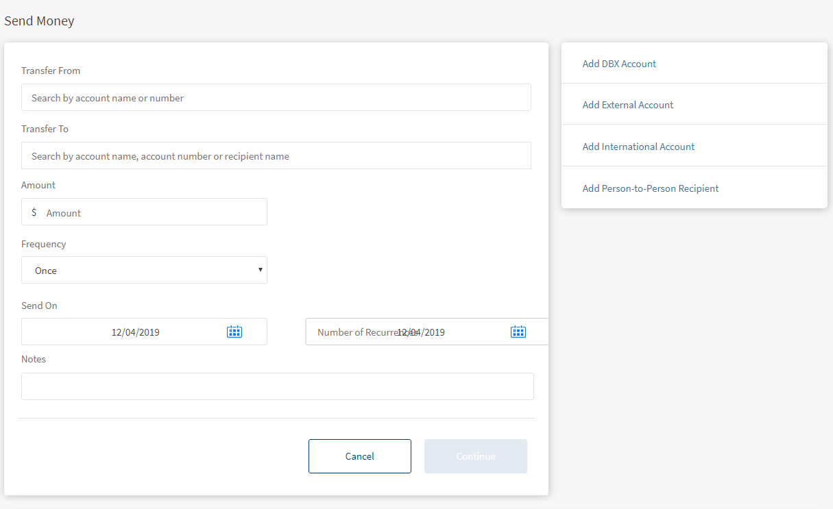 - Send Money. Initiate a new fund transfer to the user's own accounts within the same bank. to other accounts within the same bank, to other bank accounts, to international accounts, Person to person transfers, and wire transfers.