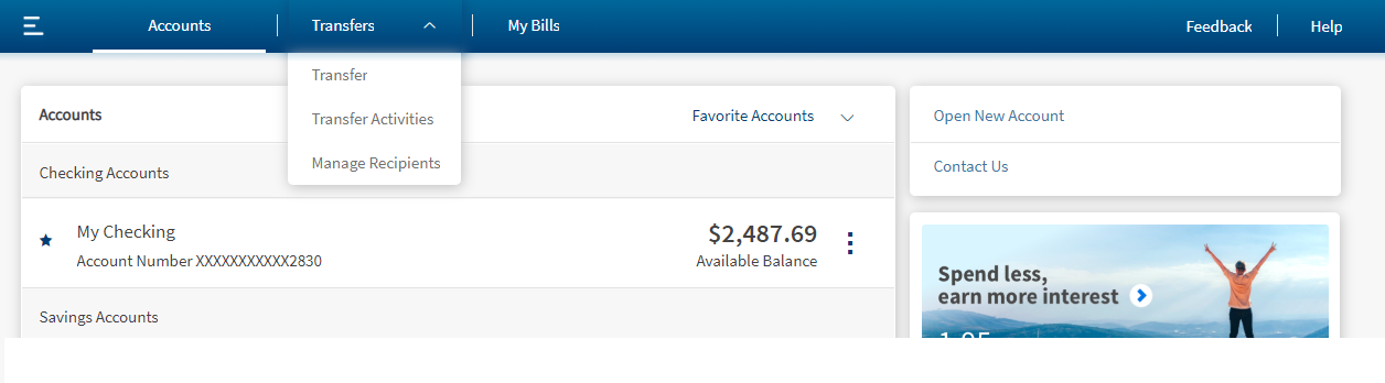The different options available under Transfers and Pay, that is, Transfer Money, Pay Bills, Send Money and Wire Transfers are displayed based on the user's entitlements within Spotlight. In case the user does not have access to any of these, that option is not available here and in the corresponding menu in the navigation pane.
