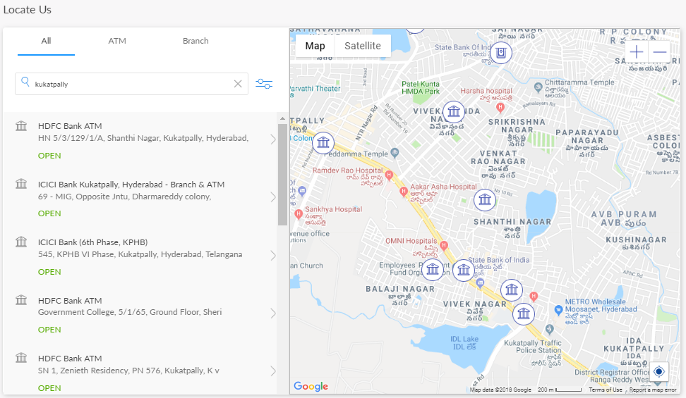By default, the app displays all the ATMs and branches near you together in All tab. Select ATM or Branch tab if you want to view only ATMs or branches near you.