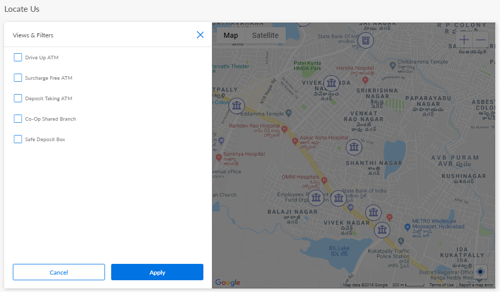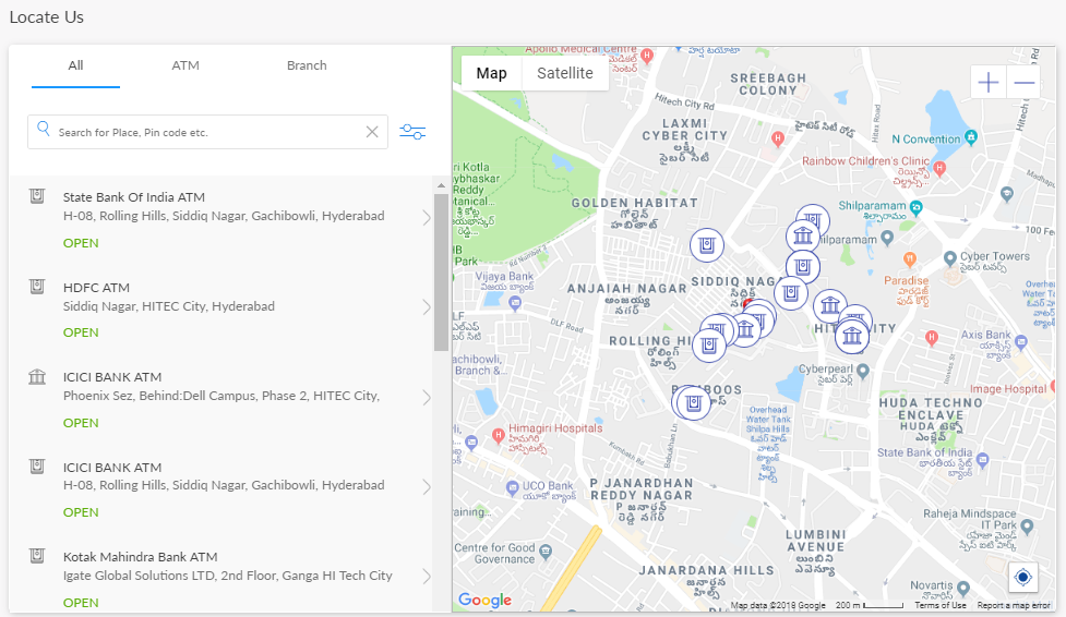 By default, the app displays the nearest ATM/branch of your bank on the Maps screen in both list-view and map-view formats. When you use this feature for the first time, the app requests your permission to access your current location. If you click Block, the app displays a message that the browser does not support Geo-location and does not display the maps screen. Click Allow. The app displays the ATMs and branches near your current location on the maps screen. The app indicates your current location by using a different-colored pin. If no results are found, the app displays an appropriate alert message. You can also switch between maps-view and satellite-view.