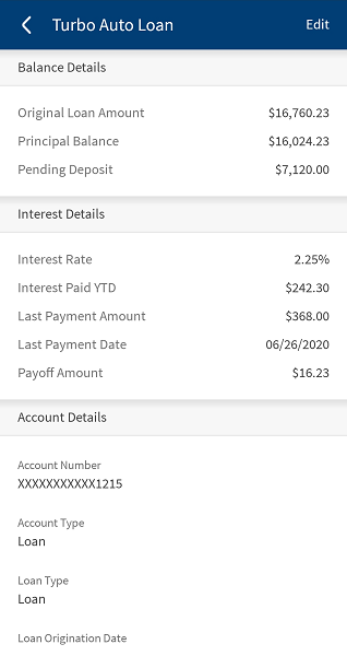 This feature is integrated with Transact using IRIS APIs to pull and display the details of a selected account (includes Savings, Checking, Loans, and Deposits) to which the authorized user has access. View the account summary details with the following details. The fields change based on the selected account type.