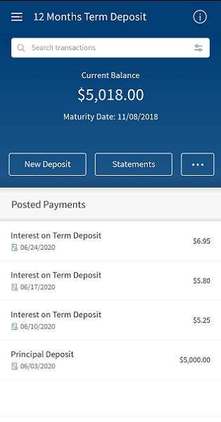 This feature is integrated with Transact using IRIS APIs to pull and display the details of a selected account (includes Savings, Checking, Loans, and Deposits) to which the authorized user has access. View the interest details with the following details. The fields change based on the selected account type.