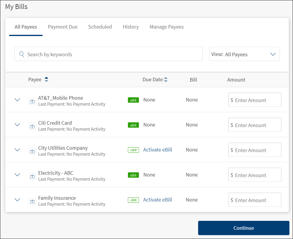 - Payment Due. Click to view the details of due bill payments. Expand any bill payee to make a new bill payment to that payee.