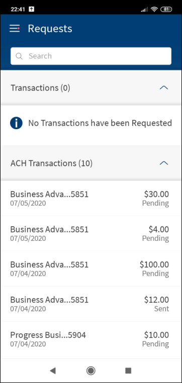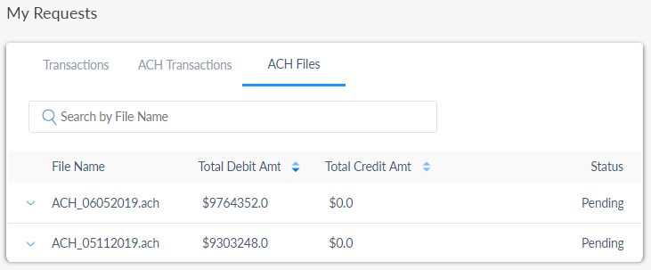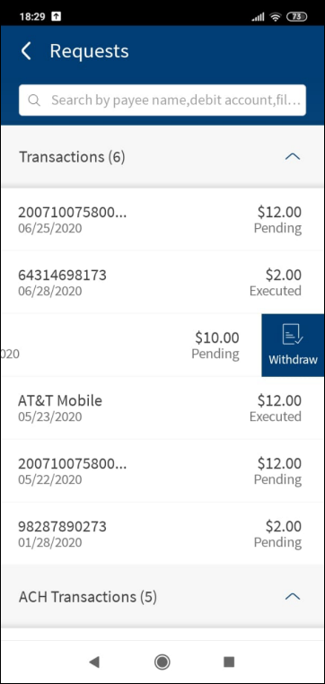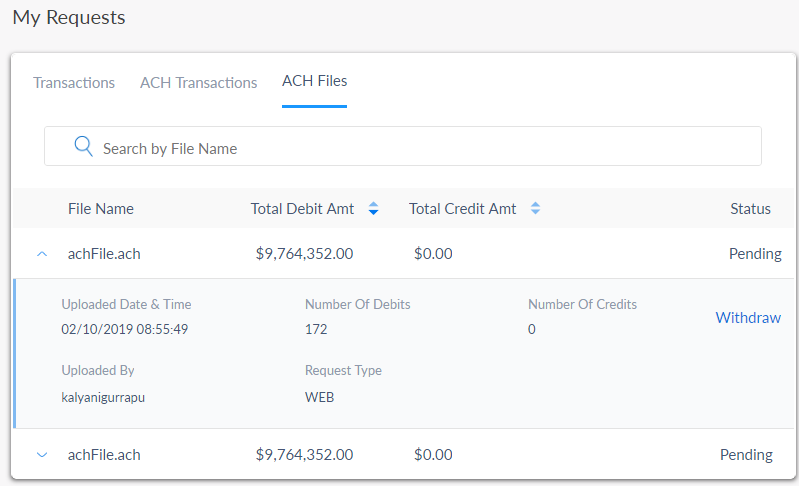 - Requests. Tap to view the list of transactions and ACH Files and withdraw transactions if required.