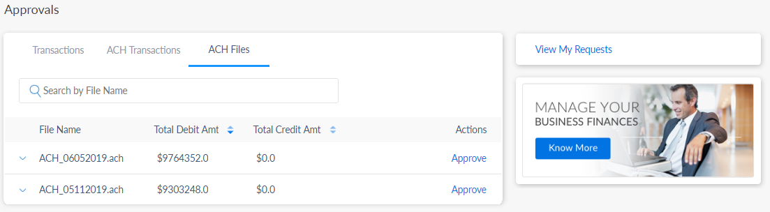 View the list of ACH files uploaded by the signed in user and needs approval to complete the process. If there are no pending ACH files that require approval, then the application displays an appropriate message.