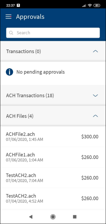 View the list of ACH files uploaded by you and needs approval to complete the process. If there are no pending ACH files that require approval, then the application displays an appropriate message.