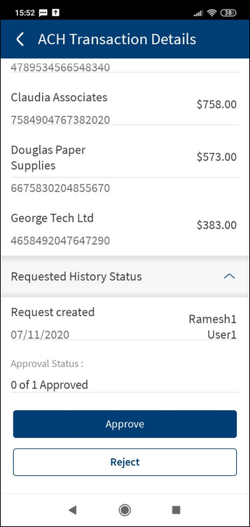 - Click to approve or reject the ACH transaction or go back to the approvals dashboard screen.