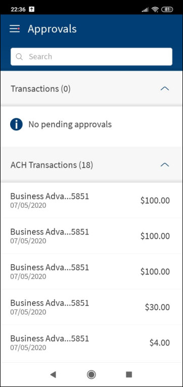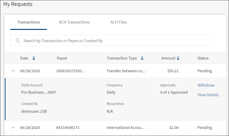 View the list of transaction requests raised by the signed in user and needs approval to complete the transaction. If there are no transactions requests raised that require approval, then the application displays an appropriate message. All transactions except the (automated clearing house) ACH transactions are shown here.