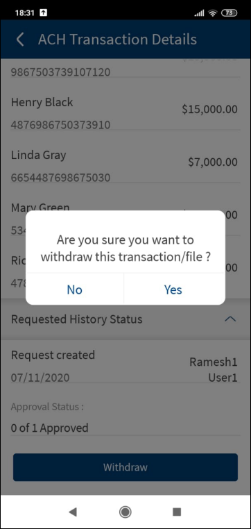 arrow displayed beside each transaction to view the details. - Withdraw the selected transaction. Click Withdraw and enter the reason to withdraw the transaction. Click Yes. The transaction request is withdrawn. The transaction is removed from the approval queues for all approvers. Even if a few approvals are received, a transaction request can be withdrawn while it has still not been executed.