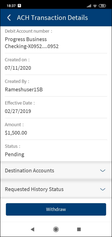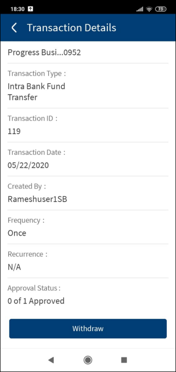 - View transaction details. Tap any row to view the transaction details, and if required, withdraw the transaction before it is approved or rejected.