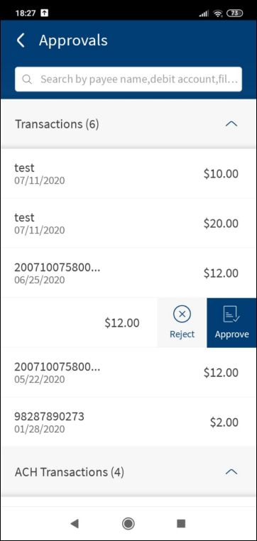 View the list of ACH transactions (payment or collection) pending for your approval or rejection. The application lists only those transactions that have been explicitly sent to you for approval.