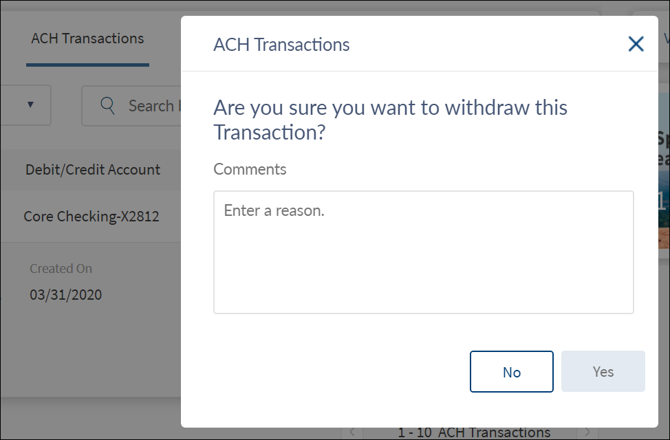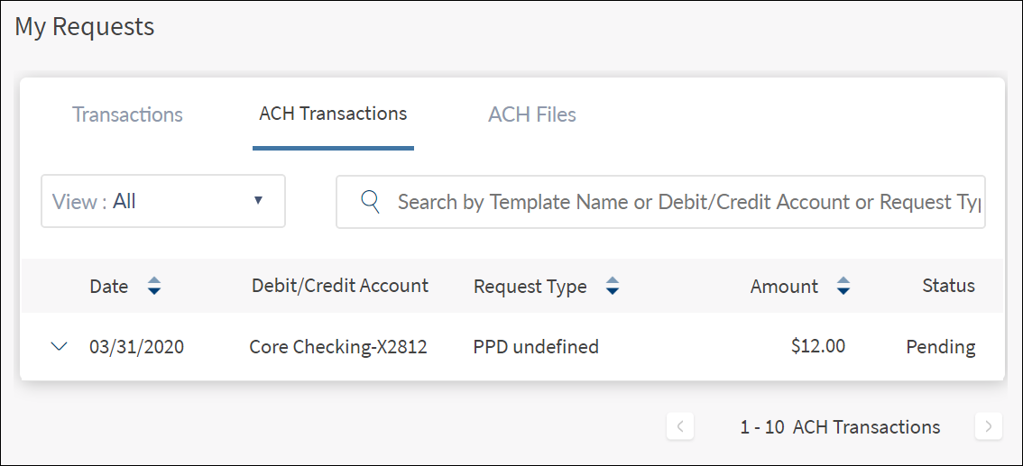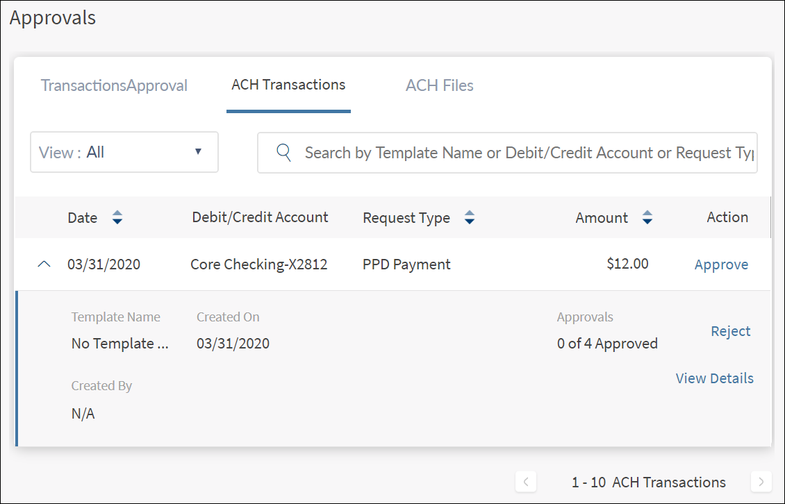 View the list of ACH transaction requests raised by the signed in user and needs approval to complete the transaction. If there are no ACH transactions requests raised that require approval, then the application displays an appropriate message