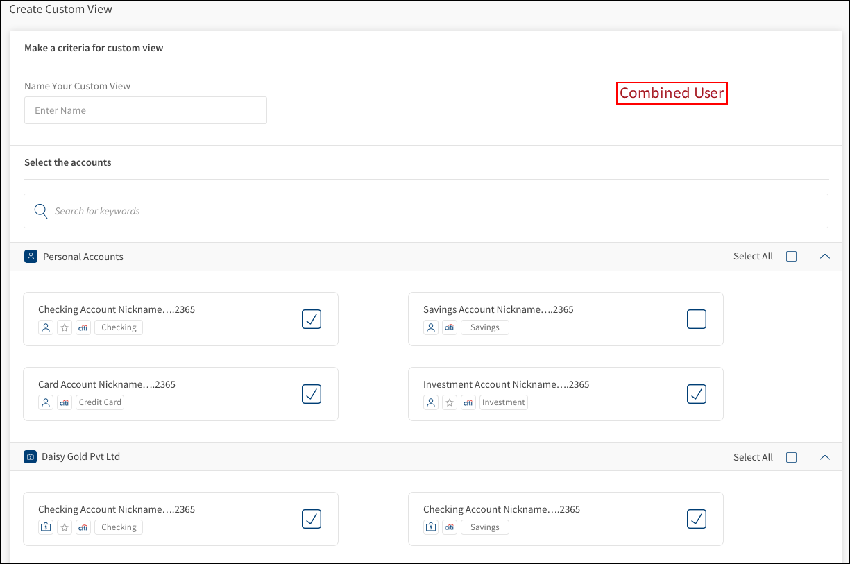 - Select the required accounts. It is mandatory to select at least one account. Only the selected accounts will show in the custom view.