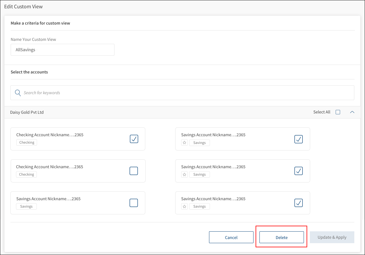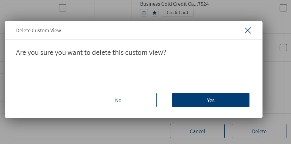 - Online Banking: Dashboard > Accounts list filter > Custom Views section > Edit screen> Delete