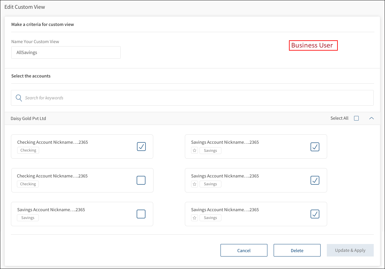 The custom view feature enables an authorized user (combined access/standalone retail/standalone business user) having access to the custom views feature to create and manage custom views for the dashboard. Using the custom views, a user can view the subsets of own accounts on the dashboard based of the selection of accounts apart from the standard views available in the accounts list filter. Authorized users can edit or delete the custom views.