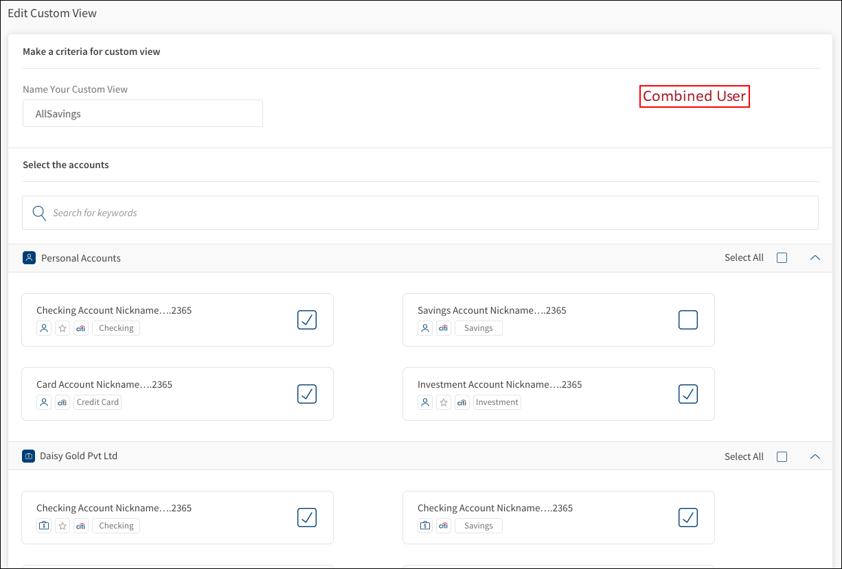 - Online Banking: Dashboard > Accounts list filter > Custom Views section