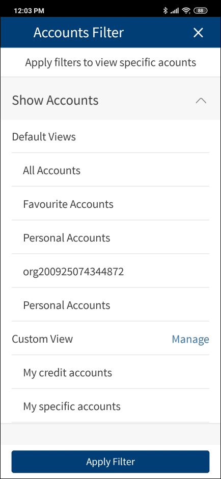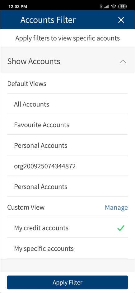 - From the Custom Views section, click the required view to be applied. For mobile banking, select the view and tap Apply Filter. The view is applied.