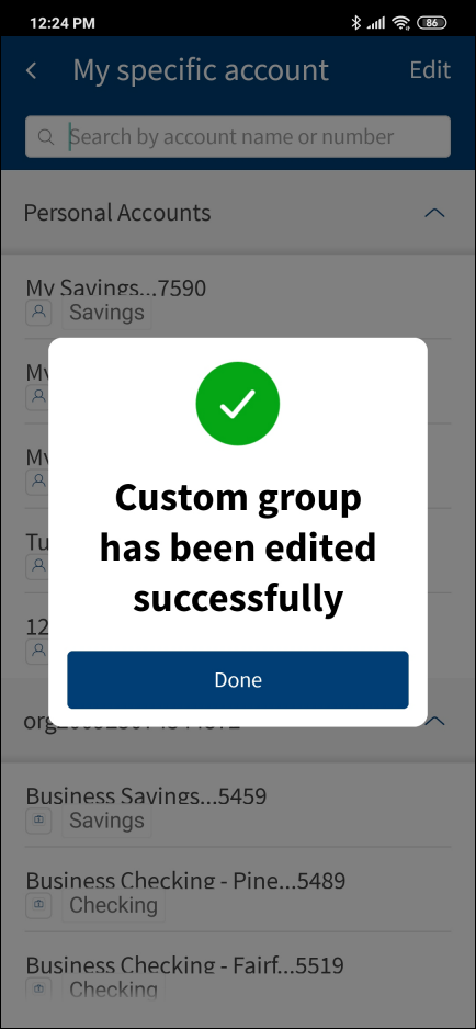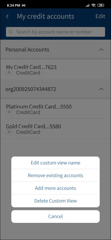 - Mobile Banking: Menu > Dashboard > Accounts list filter > Custom Views section > Manage > Select a view > Edit