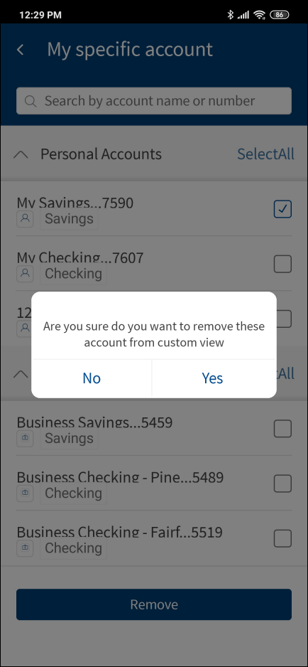 - Remove existing accounts. The accounts that are already part of the custom view are only displayed. Select the account check boxes to remove accounts. Tap Remove. The button is enabled only if any modification is done on the screen. The application displays a confirmation screen. Tap Yes to remove the selected accounts. The application displays an acknowledgment screen.