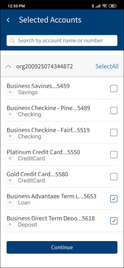 - Tap Continue. The button is enabled only if at least one account is selected.