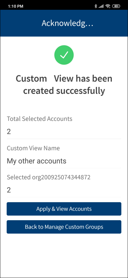 - Add more accounts. The application displays accounts that are not already part of the custom view. Select the account check boxes to add accounts. Tap Add Account. The button is enabled only if any modification is done on the screen. The application displays a confirmation screen. Tap Yes to add the selected accounts. The application displays an acknowledgment screen.
