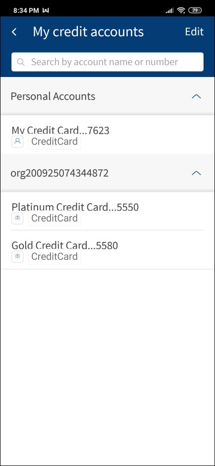 - For a business user, the application displays all business accounts that the business user has been given access. For a combined user, the application displays all business and personal accounts that the user has been given access.