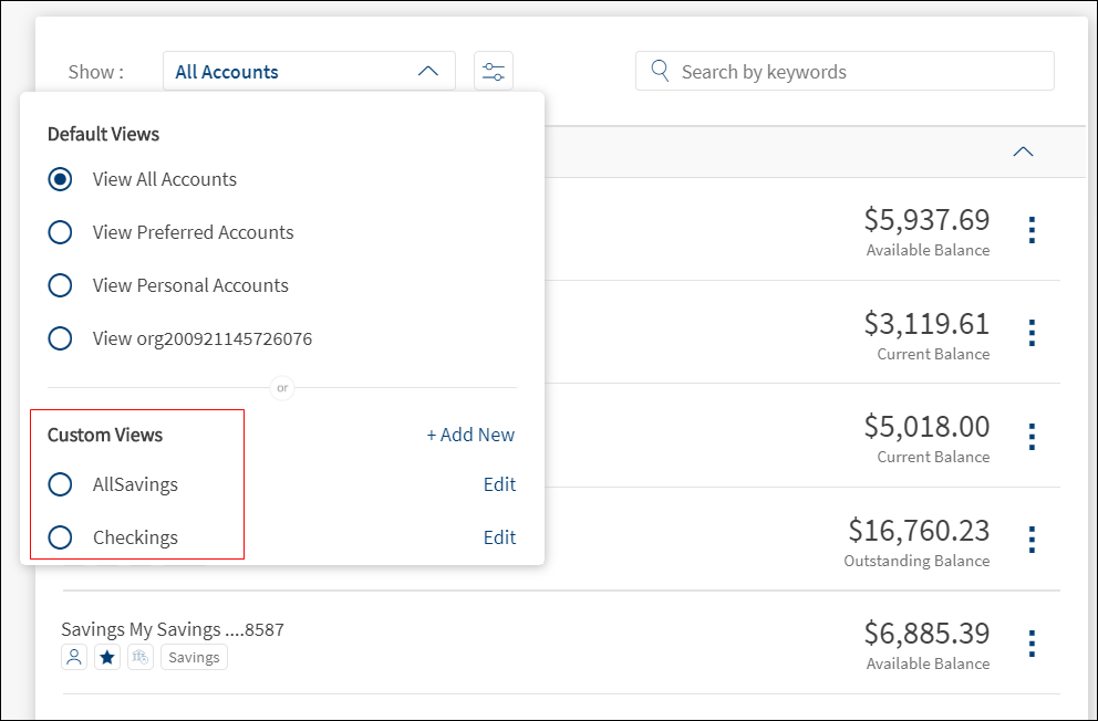 - Online Banking: Dashboard > Accounts list filter > Custom Views section > Select a view