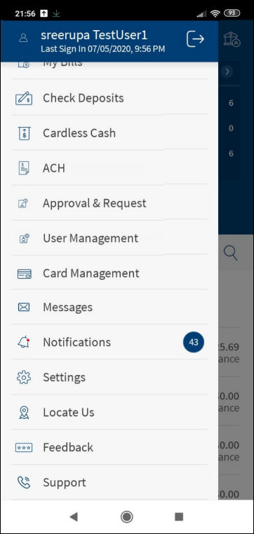 The visibility of the menu items on the hamburger or side menu is controlled through the permissions defined for the signed in business user. See permissions for more information on permission details and online banking menu for more information on the menu items and description.