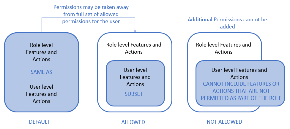 A role defines the highest level of permission that is given to a business user and can even contain permissions to a partial set of actions for a feature, and the permissions can be restricted at the user level as well. A user’s permissions are governed by two things - permissions it inherits from the role and the permissions given to the Company / Business. However, a business owner or an authorized person can take away some of the permissions that the user inherits from a role. Therefore, it is possible to have a custom set of permissions for every user. For example, Bill Pay can be turned on or off for a specific company customer of the bank, a role within that company, or for a specific user within the company. The following graphic explains the permissions concept.