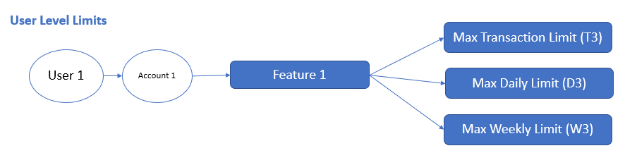 For a transaction to meet the allowed daily transaction limit, the following three conditions should be met. Say for instance that a transaction of value X is being made on Account 1 by User 1 using a feature like Bill Pay (Feature 1). Also, we can say that this specific user 1 has been assigned a role “Role1”.