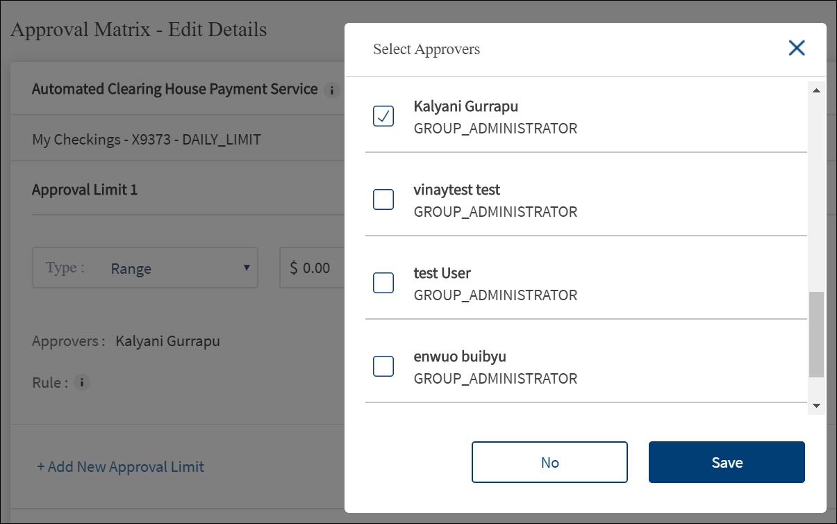 - Select the authorized approver(s) from the list. The application displays only those users that have access permissions for the transaction type on the selected account. It is mandatory to select atleast one approver and depends on the approval rule. If the approval rule says "Any two approvers are required", then it is mandatory to set at least two approvers. The minimum number of names required to be added depends on the approval rule selected. Click Save. The selected name(s) is added as an approver for the transaction.