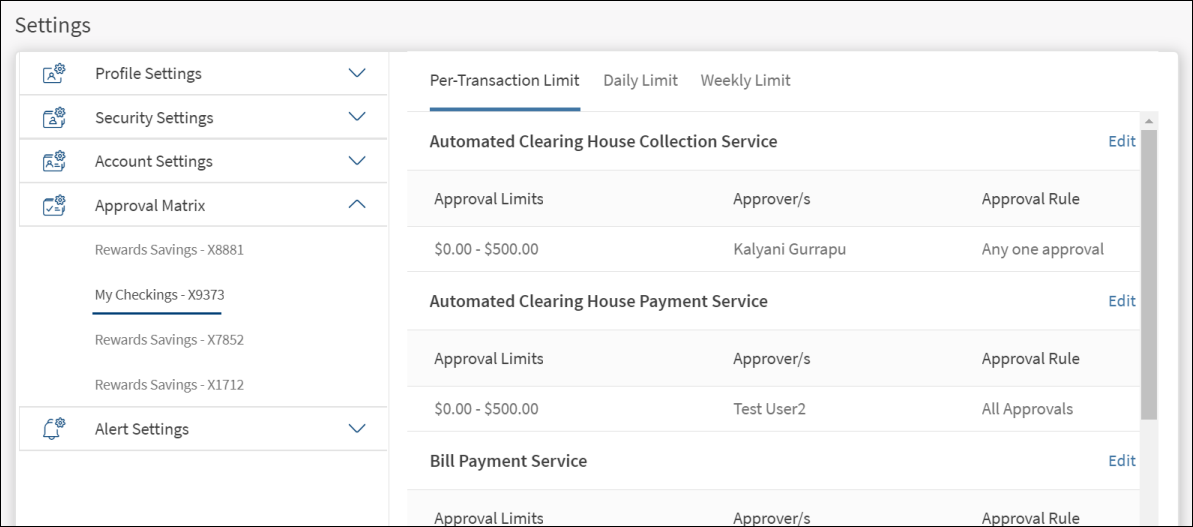 The approval matrix defines the rules for approvals including the number of approvals required and the designated approver, based on the value of the transaction. Use the feature to define the approval limits (per transaction, daily and weekly) for each account associated with the company.
